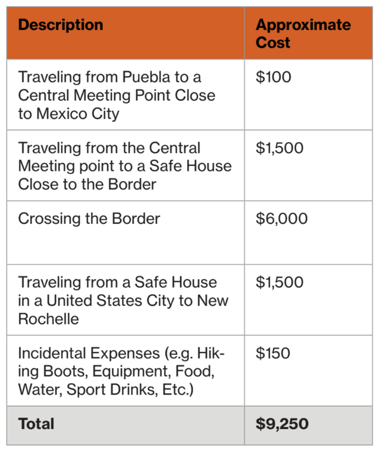 The individuals I spoke with explained that the journey from Puebla, Mexico to New Rochelle, New York, had four distinct stages: 1) traveling from Puebla to a central meeting point close to Mexico City; 2) traveling from the central meeting point to a safe house close to the border; 3) crossing the border; and 4) traveling from a safe house in a U.S. city to New Rochelle.