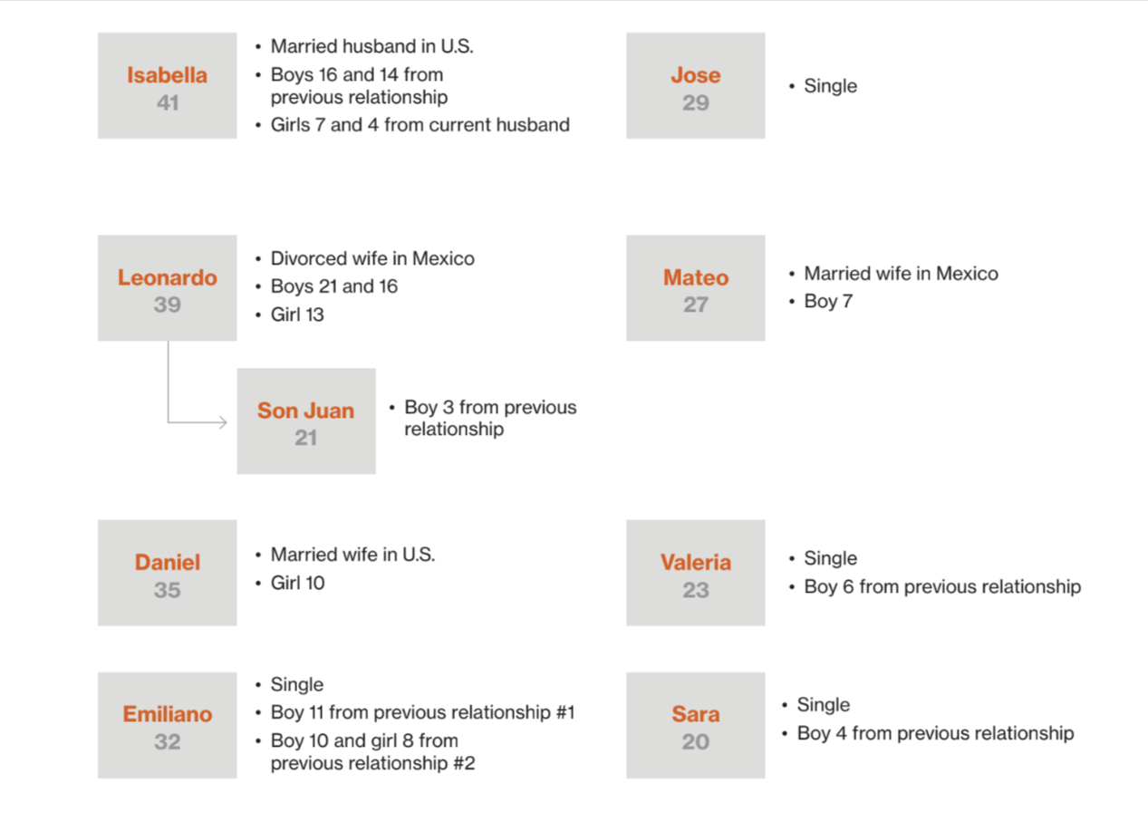 Many entered into more mature, stable relationships in their 20s. However, they were still unable to support their spouses/partners and all of their children, a fact that nudged them toward the decision to migrate. The U.S. promised a larger income. The decision to migrate effectively became a decision to separate from one’s spouse/partner and leave one’s children. During our interviews, a refrain repeated itself.