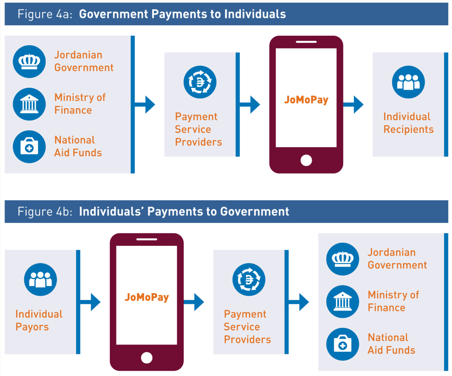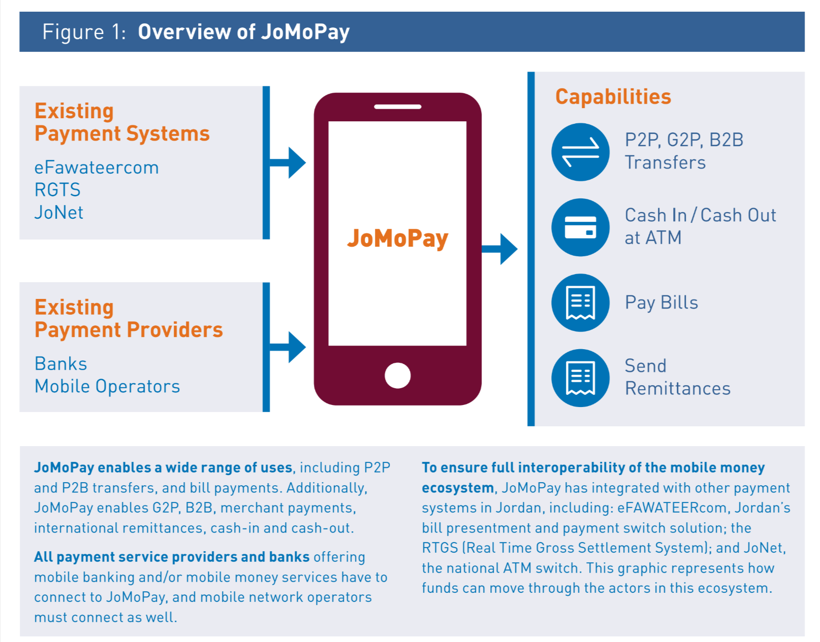 Part of the financial inclusion package proposed by the Central Bank is Jordan Mobile Payments, or JoMoPay. JoMoPay is a national centralized payment switch that connects end users (through a mobile device) to