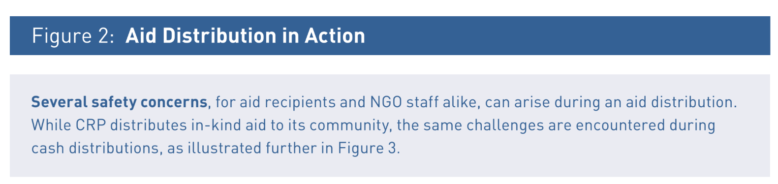 For volunteer-run organizations like CRP with few hands on deck and few resources at their disposal, cash and in-kind distributions take an extraordinary amount of time and effort. “We’re small,” says Lane, “so we can’t just go to a bank and set up cash distributions for our beneficiaries. That would be a gargantuan task for us to carry out…We’re trying to figure out what’s the most effective way to do distributions with the model we have now. We’re not able to move to an easier model unless something like JoMoPay comes along.”