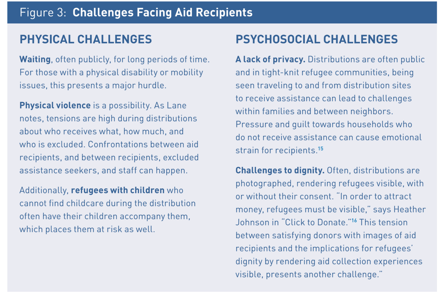 Lane has witnessed the conditions that make physical distributions and cash withdrawals so difficult. For starters, there are logistical, health, and safety issues to consider for both the refugees and staff. At CRP, “it can definitely be a security issue. We have so many new people coming to us…and what this means is we sometimes have over a hundred people who come saying, ‘oh, my name’s on the list,’ and it’s not,” she says. “This creates a lot of interpersonal and anger management issues at our center. It’s a lot to manage.” These confrontational scenarios present not only a challenge for crp, but also for the many who stand in line, sometimes for hours and in all types of weather, waiting for their distributions. “people coming and waiting in line to pick up goods is excruciating,” lane explains. “they stand outside for a long time, and our ability to help people with mobility issues is very much limited.”