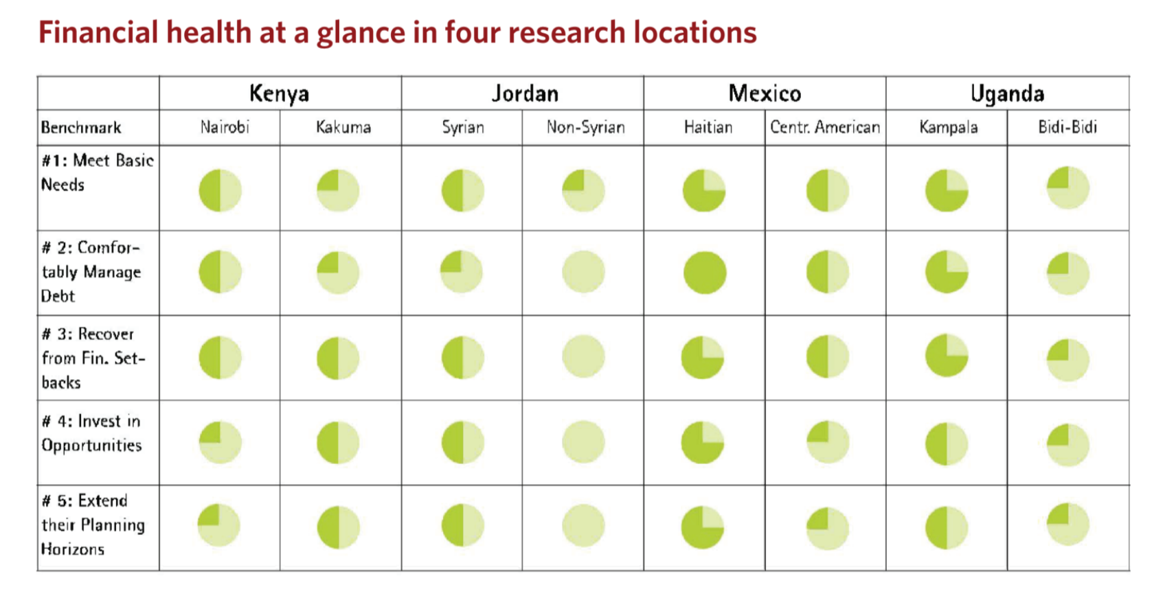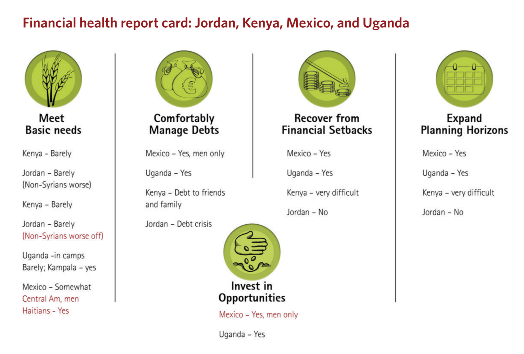 Throughout this piece, we have reviewed the livelihoods, financial portfolios, and systemic issues that refugees and migrants face in Kenya, Jordan, Mexico, and Uganda. Based on these findings, we produced these “report cards” on the financial health of our respondents: