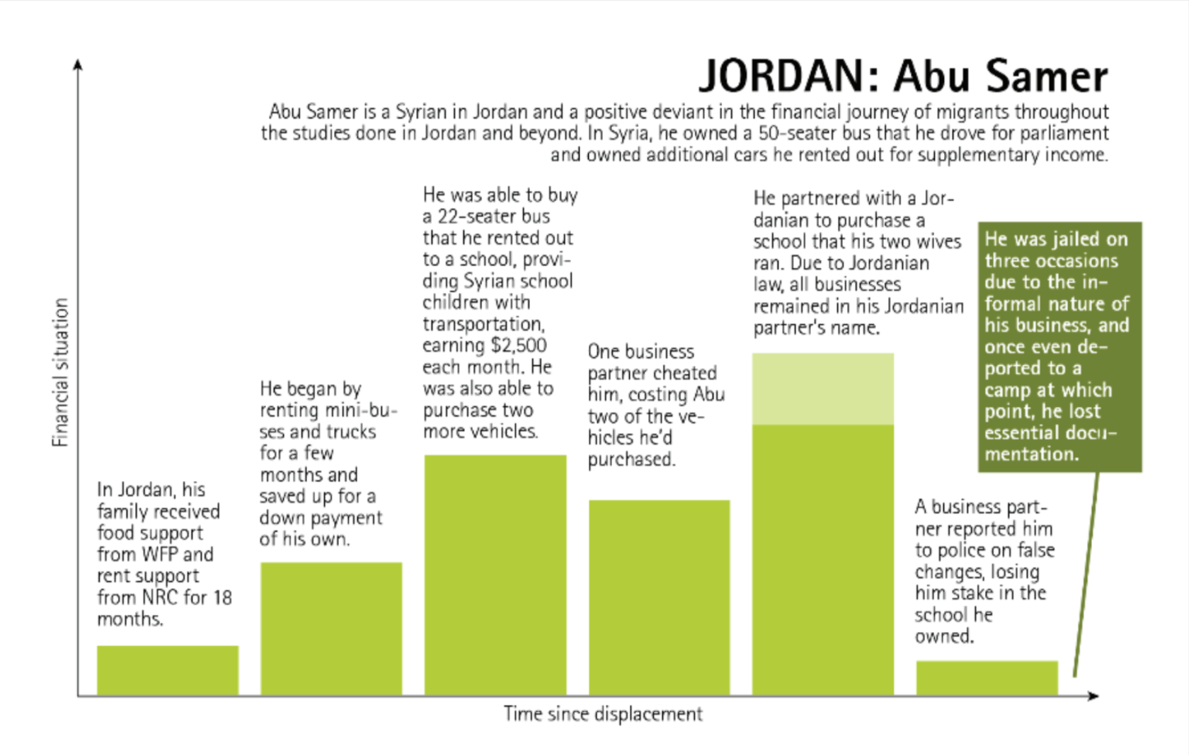We observed examples of positive deviants in all sites, refugees who could make a go of things despite their circumstances. Initially, for Abu Samer (a Syrian in Jordan), livelihood prospects seemed promising. He was able to achieve prosperity through frugality, creativity, and hard work. Yet over time, those prospects became less promising. We can see this in his story below: