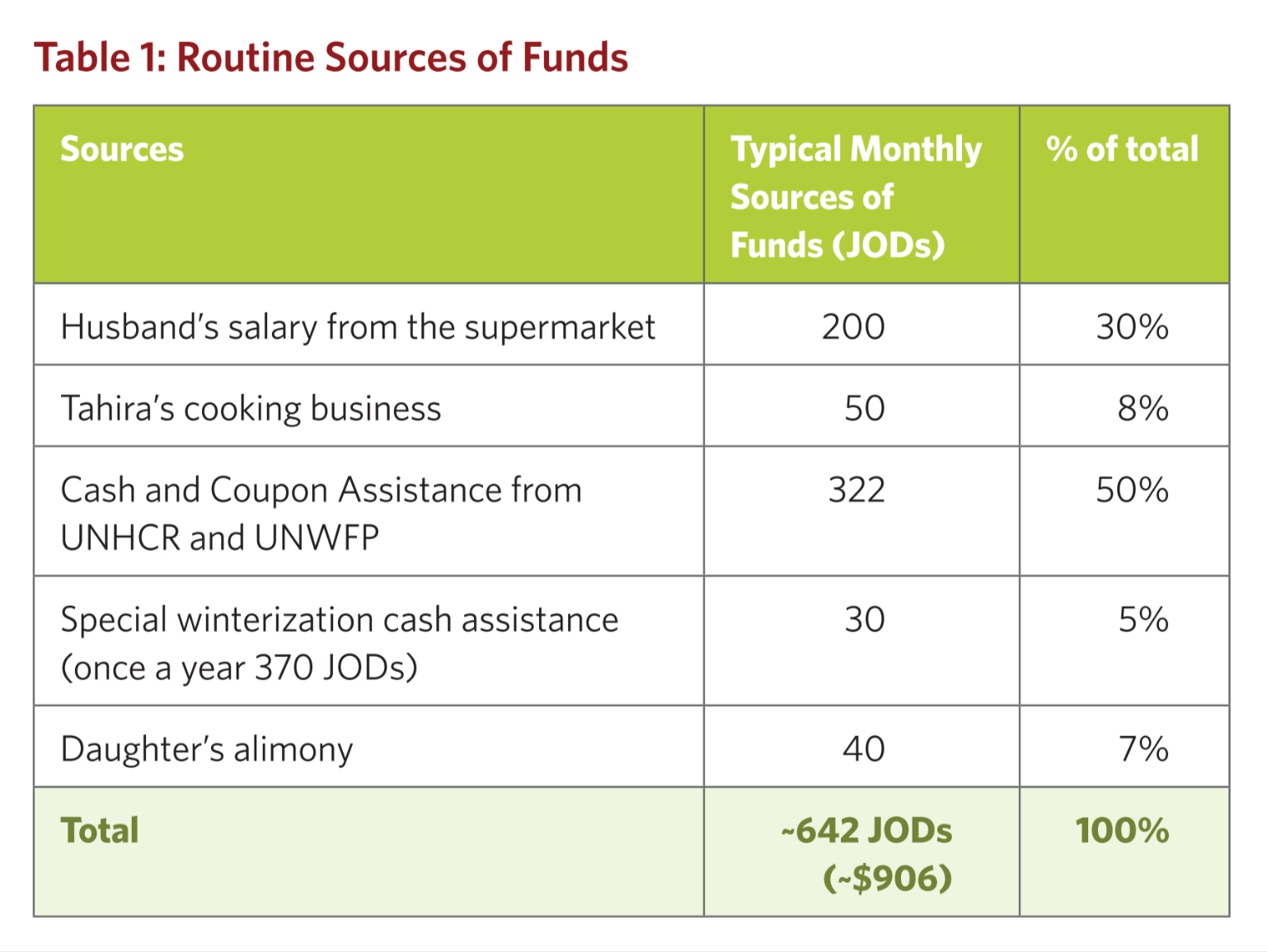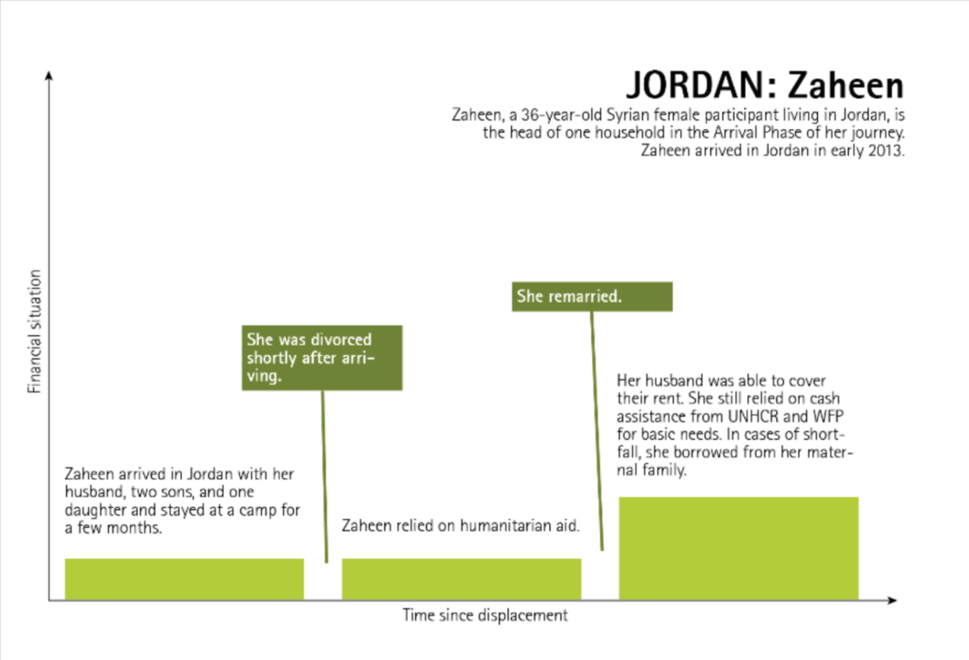Zaheen, a 36-year-old Syrian female participant living in Jordan, is the head of one household in the Arrival Phase of her journey. She arrived in Jordan in early 2013 with her husband, two sons, and one daughter and stayed at a camp for a few months. She was divorced shortly after arriving. At this point, Zaheen relied completely on humanitarian aid to provide for her family until she remarried a working man whose salary was able to cover their rent. Still, Zaheen depended on cash assistance from UNHCR and WFP to meet her children’s needs.