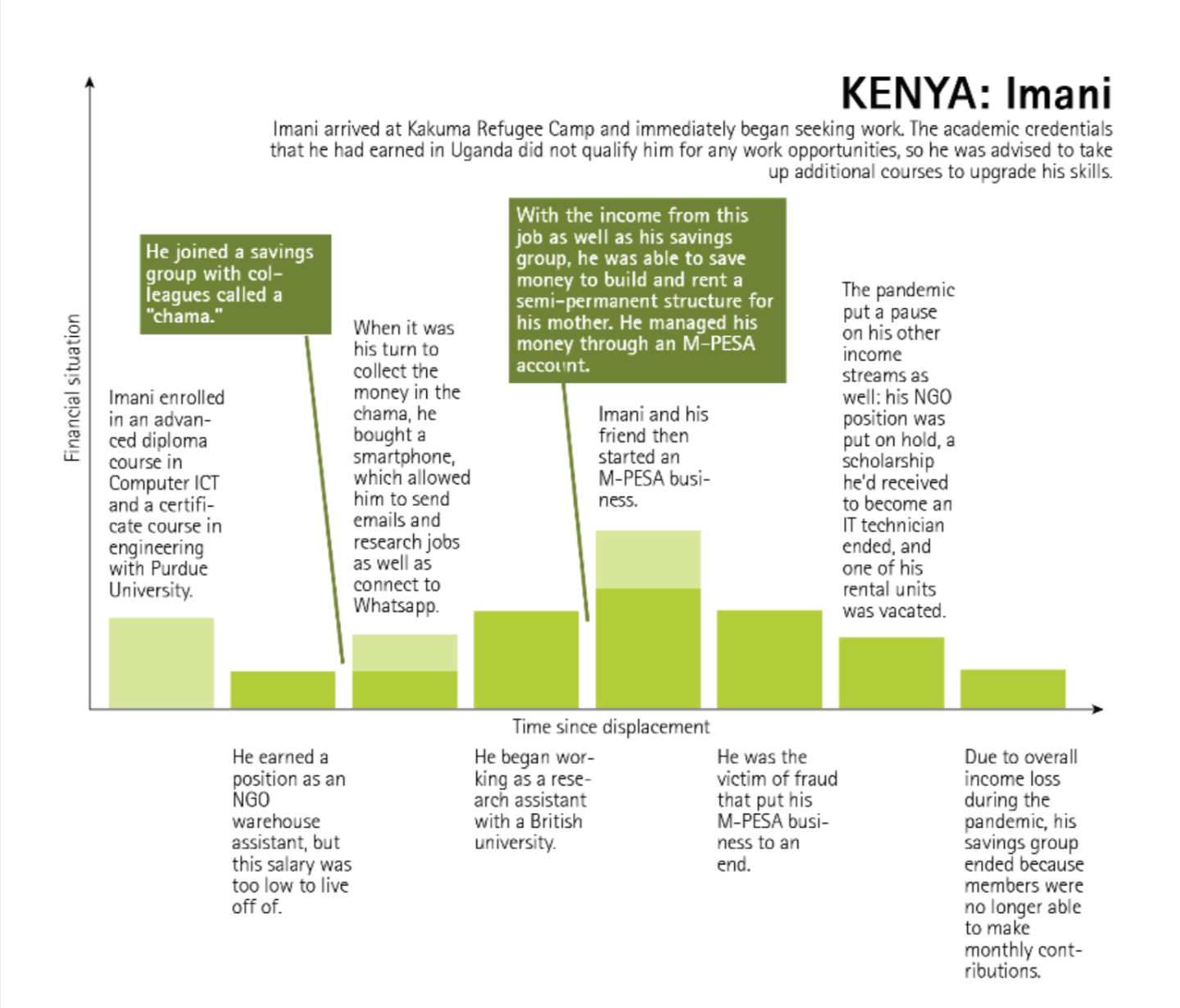 Imani arrived at Kakuma Refugee Camp and immediately began seeking work. The academic credentials that he had earned in Uganda did not qualify him for any work opportunities, so he was advised to take up additional courses to upgrade his skills; he enrolled in an advanced diploma course in Computer ICT and a certificate course in engineering with Purdue University. He earned a position as an NGO warehouse assistant, but this salary was too low to live off of. He joined a savings group with colleagues. When it was his turn to collect the money in the group, he bought a smartphone, which allowed him to send emails and research jobs.