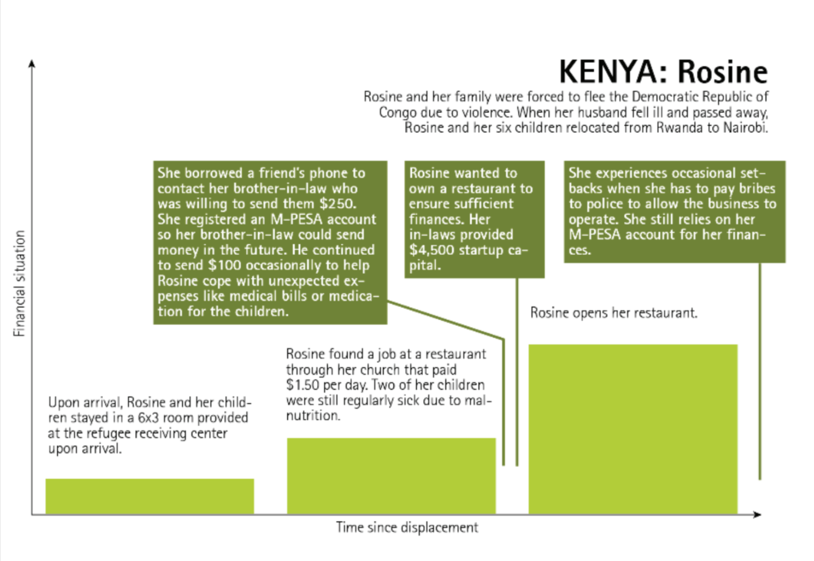 Initially, Rosine’s low cash flow did not necessitate financial services because when she received the initial remittance from her brother-in-law, she was able to register an M-PESA account—a common mobile money financial service in Kenya—which she used to receive future remittances from her in-laws directly. Even after opening the restaurant, she did not have a bank account, but she was able to use her M-PESA account to put away her monthly savings.