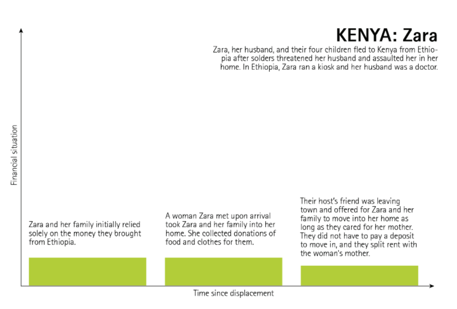 Zara, her husband, and their four children fled to Kenya from Ethiopia after soldiers threatened her husband and assaulted her in her home. When they arrived in Kenya, they sat on a corner, trying to decide what to do next. There was a woman selling food there on the corner. Zara introduced herself and bought some food for her kids.