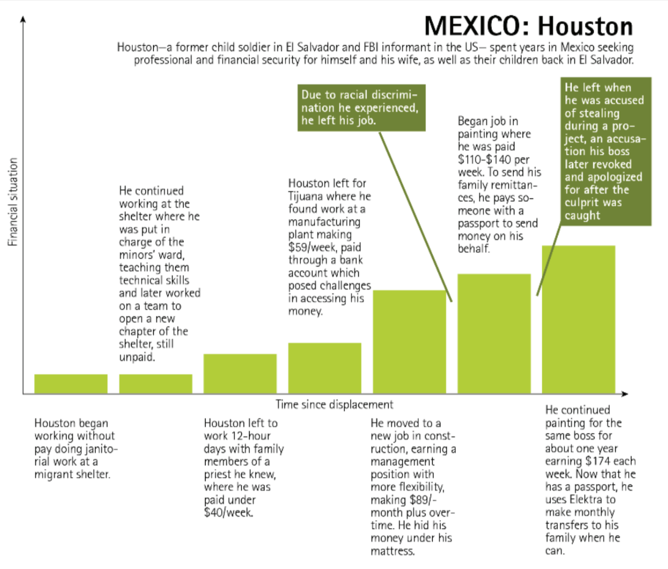 Houston—a former child soldier in El Salvador and FBI informant in the US— spent years in Mexico seeking professional and financial security for himself and his wife, as well as their children back in El Salvador. He began working without pay, doing janitorial work at a migrant shelter. He continued working at the shelter, where he was put in charge of the minors’ ward, teaching them technical skills. He left the shelter after working on a team to open a new chapter, but still without pay. Houston left to work with the family members of a priest he knew, but was paid under $40 per week despite putting in twelve-hour workdays. So, he went to Tijuana and stayed on the floor of a former shelter resident.