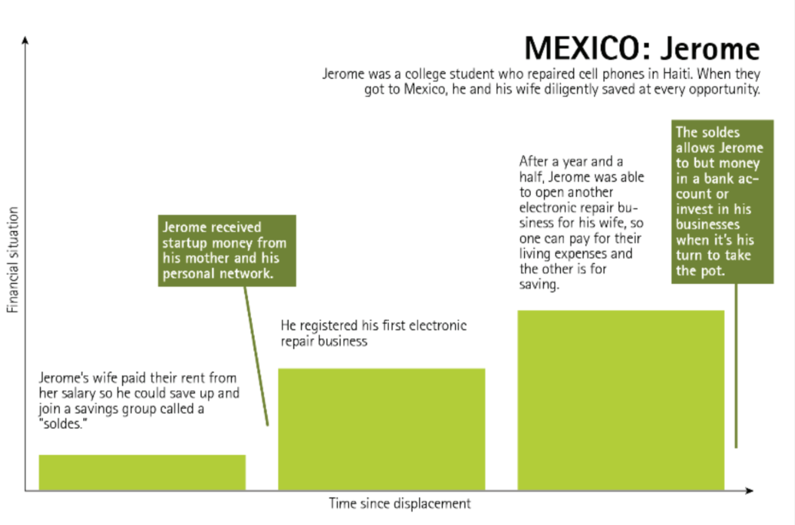 Jerome was a college student who repaired cell phones in Haiti. When they got to Mexico, he and his wife diligently saved at every opportunity. At first, his wife paid for their rent from her salary so he could save up and get into an informal savings group called a “soldes.” Eventually, he got the idea to start an electronics repair business. His mother, a Mexican coworker, a Haitian man, and another friend lent him money that he used to register his first repair shop.