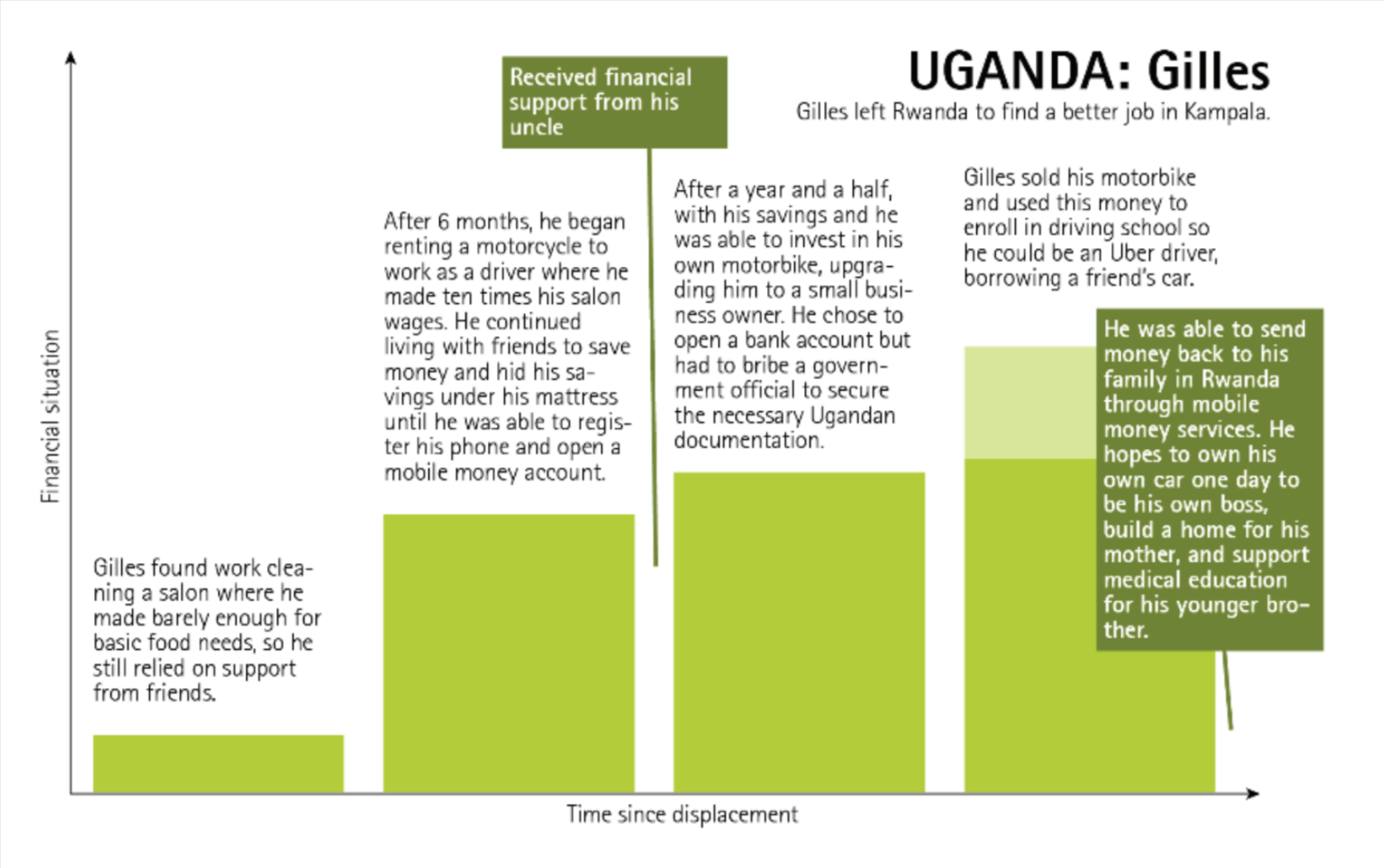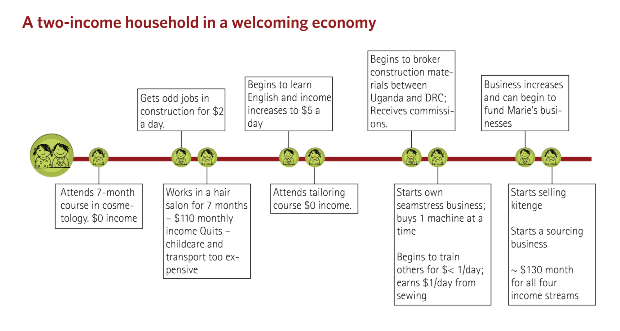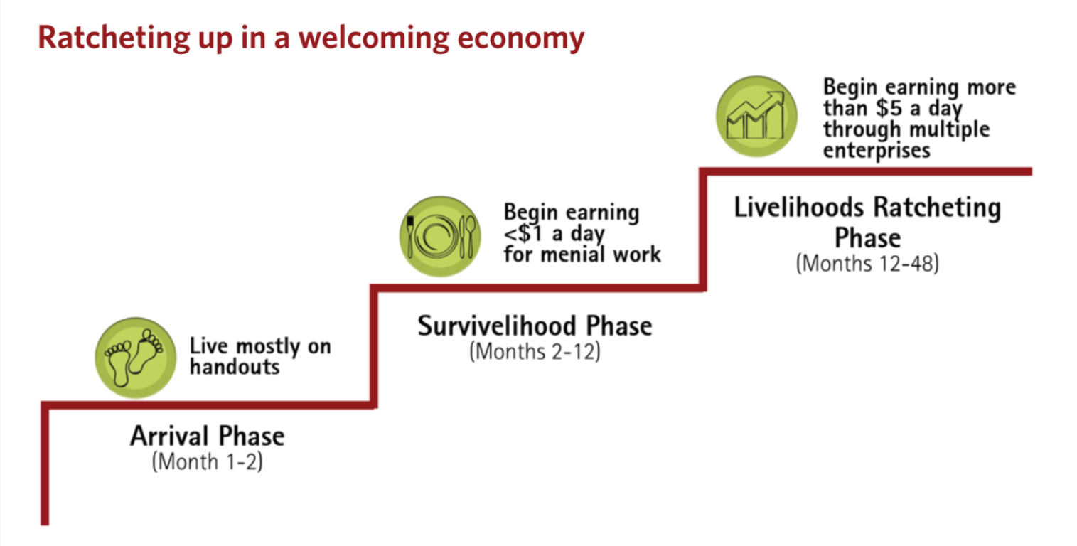 We can deduce the reasons Emmanuel and Marie were able to grow their activities. First, Uganda allows refugees to live outside camps, work, and start businesses, but equally important is that their household had two wage earners and two parents to watch over the children. Emmanuel’s ability to learn English was also helpful, as were the classes that Marie attended. The couple could weave together assorted income flows, allocating them between household needs and investments in their various income streams, driving all activities forward. Below, we can see how livelihoods like Emmanuel and Marie’s can develop in welcoming economies: