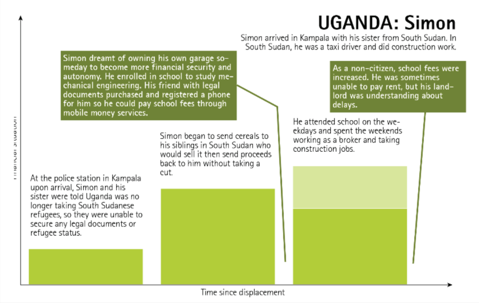 Some, but not all, graduated to finding more lucrative forms of self-employment, such as working as a barber or a musician, trading second-hand clothes or shoes, hawking fabrics or bedsheets, and selling cooked foods or running small restaurants. However, very few of these efforts turned into long-term enterprises. Instead, they frequently started, sputtered, and stopped. So instead of becoming trained and growing a single business, refugees often found themselves starting over in entirely new fields after recurrent setbacks. Below, we can see how livelihoods fail to progress in a less welcoming economy: