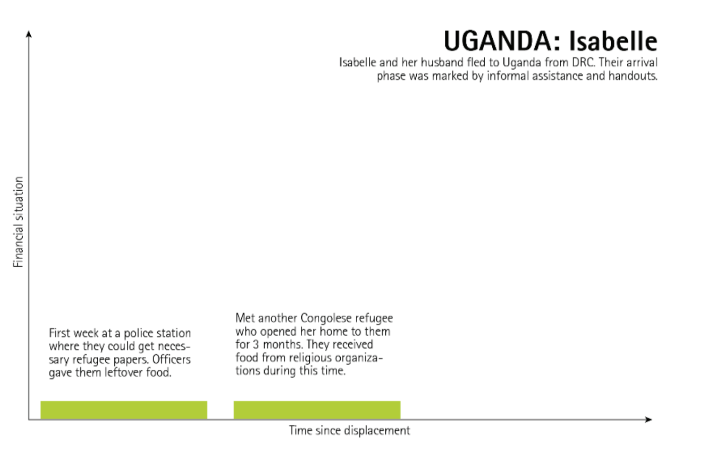 Isabelle and her husband fled to Uganda from the DRC. Their arrival phase was marked by informal assistance and handouts.