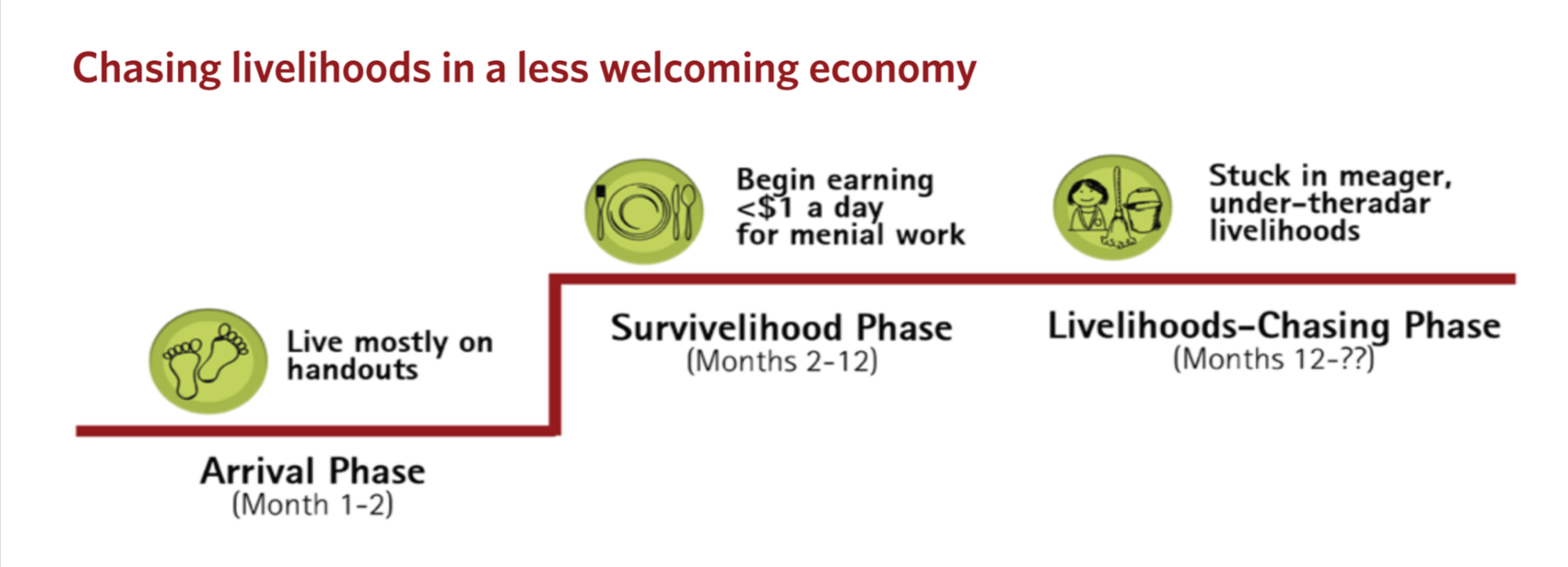 Then, after some months, respondents would begin to progress. If they were bussing tables at a restaurant, they might get promoted to wait staff and earn more. If they were sweeping the floor of a hair salon, they might be asked to braid hair for higher pay. They could open a small business, usually from home or on the street, and again improve their incomes. We termed this phase the “Ratcheting Phase,” where livelihoods would become more robust, both in income and diversity. Many were doing well enough to abandon any thoughts of moving back home or to a third country. Instead, they would stay, get their children an education, and expand their businesses.