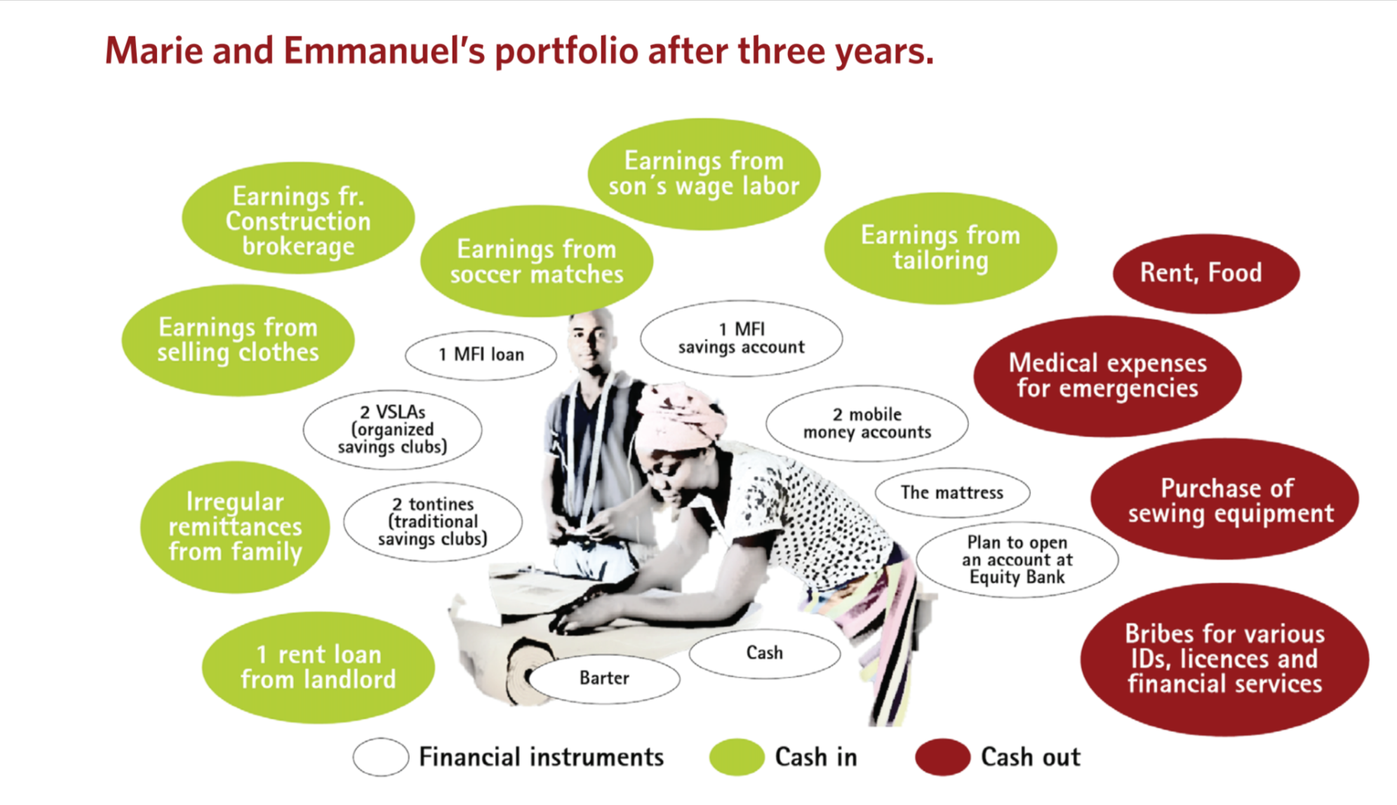 But over time, as they found their financial footing, their sources of income expanded, as did their earnings. Expenses and investments also grow. And to manage more income, they widened their use of financial instruments. Eventually, their portfolio included membership in traditional and NGO-formed savings clubs (tontines and village savings and loan clubs, as well as microfinance savings loan accounts. And they looked forward to opening an account with Equity Bank.