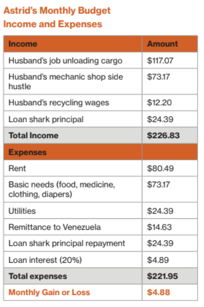 Shortly after they moved to their new house, where rent was $39 USD monthly, plus $8 USD in utilities, Astrid’s fourth child was born. A few months later, she joined her husband selling caramels, carrying her child with her throughout the day while the other children stayed at the house. “It was a risk,” Astrid sighed, “but we did not have the financial stability to do anything else.” Selling in the street, Astrid and Carlos earned a collective $10 USD daily, with the occasional good Samaritan gifting them groceries or an extra $12 USD, which they would immediately save to make rent.