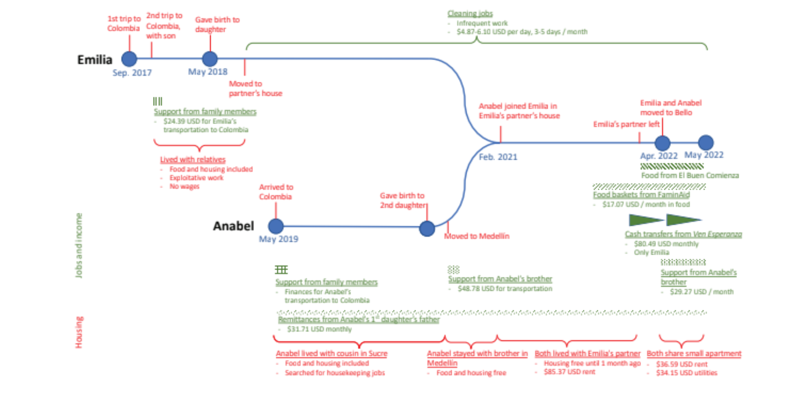 Emilia and her adult daughter, Anabel, each have two young children. As single mothers in a foreign country, they face limited opportunities but manage to survive by combining forces. Their blended household has extremely low income. Neither of them has a stable job or sufficient prospects for side hustles. To support themselves and their four dependents, they depend on support from other family members and neighbors, periodic child support payments, cash and food support from humanitarian organizations, and state-subsidized health care for a chronically ill daughter.