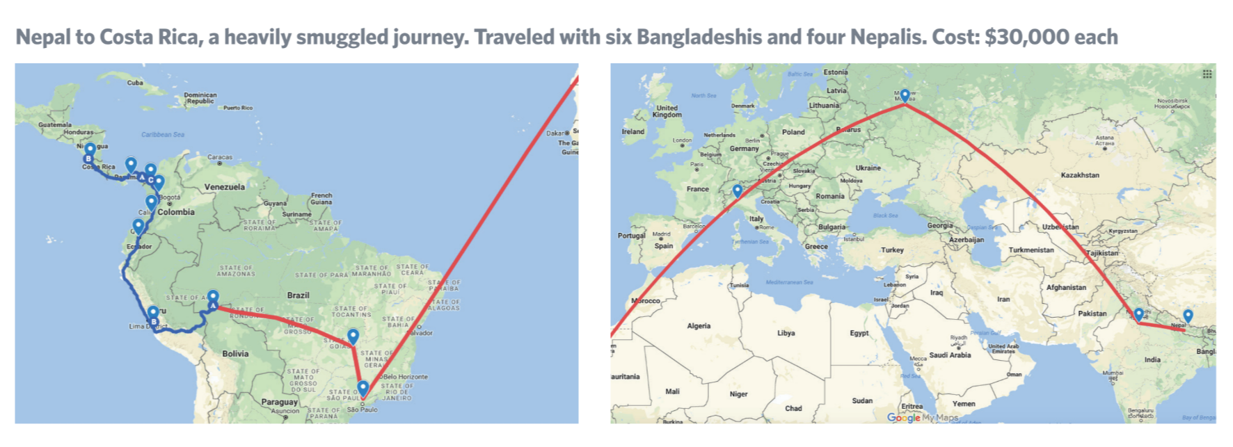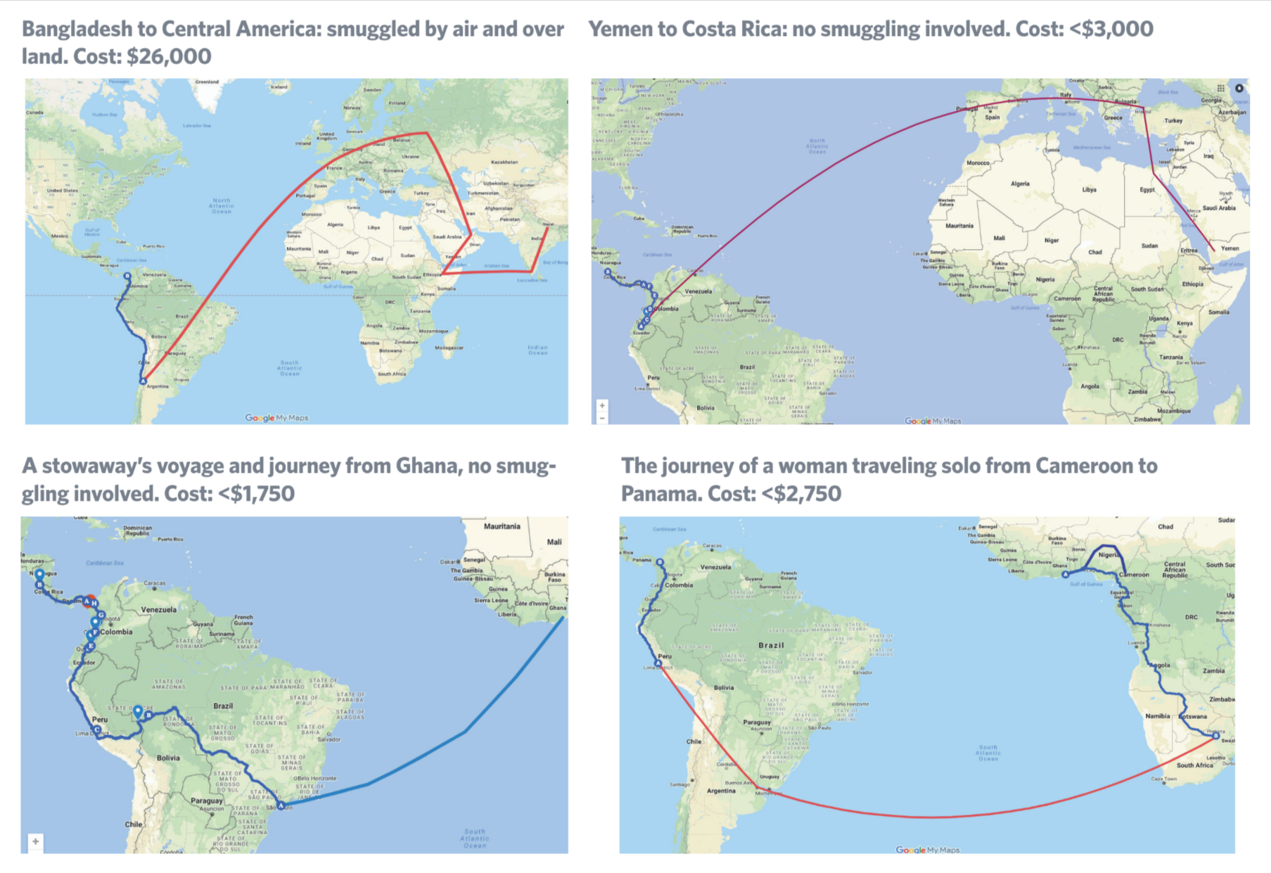 The most common ports of entry to the Americas were Brazil, Ecuador, Peru, and Guyana, with some reporting entry in Bolivia and Chile. We categorized journeys into three kinds: heavily smuggled (Nepalis and Bangladeshis), moderately smuggled (Indians, Pakistanis, Eritreans, and Ethiopians), and lightly smuggled (the rest of Africa). The costs of the journey depended on the degree to which the migrant was smuggled. Costs ranged from a low of $1,750 (Ghana) to a high of $40,000 (Nepal).