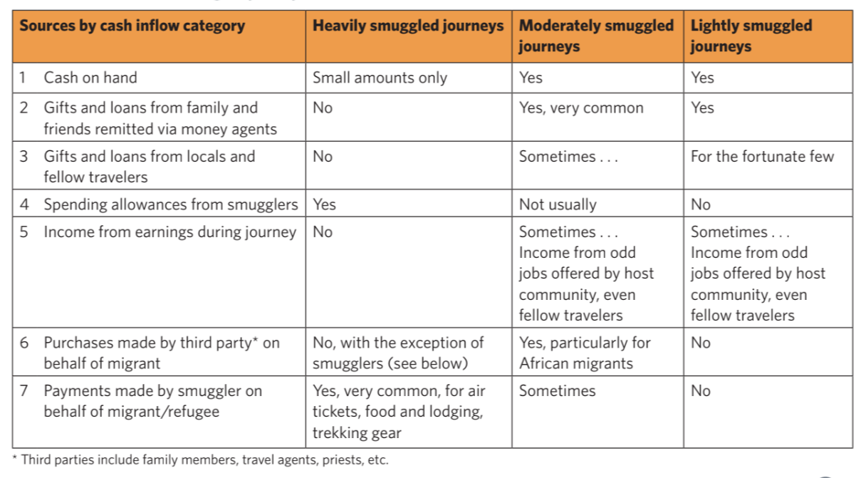 Migrants and refugees assembled financial portfolios that reflected their status as a person on the move. These portfolios resembled those of stationary populations only in part. Other properties were particular to migration. Sources of funds not only included cash on hand but also payments made on the migrant’s behalf. Table 2 summarizes the common sources of funds categorized by the degree to which migrants were smuggled.