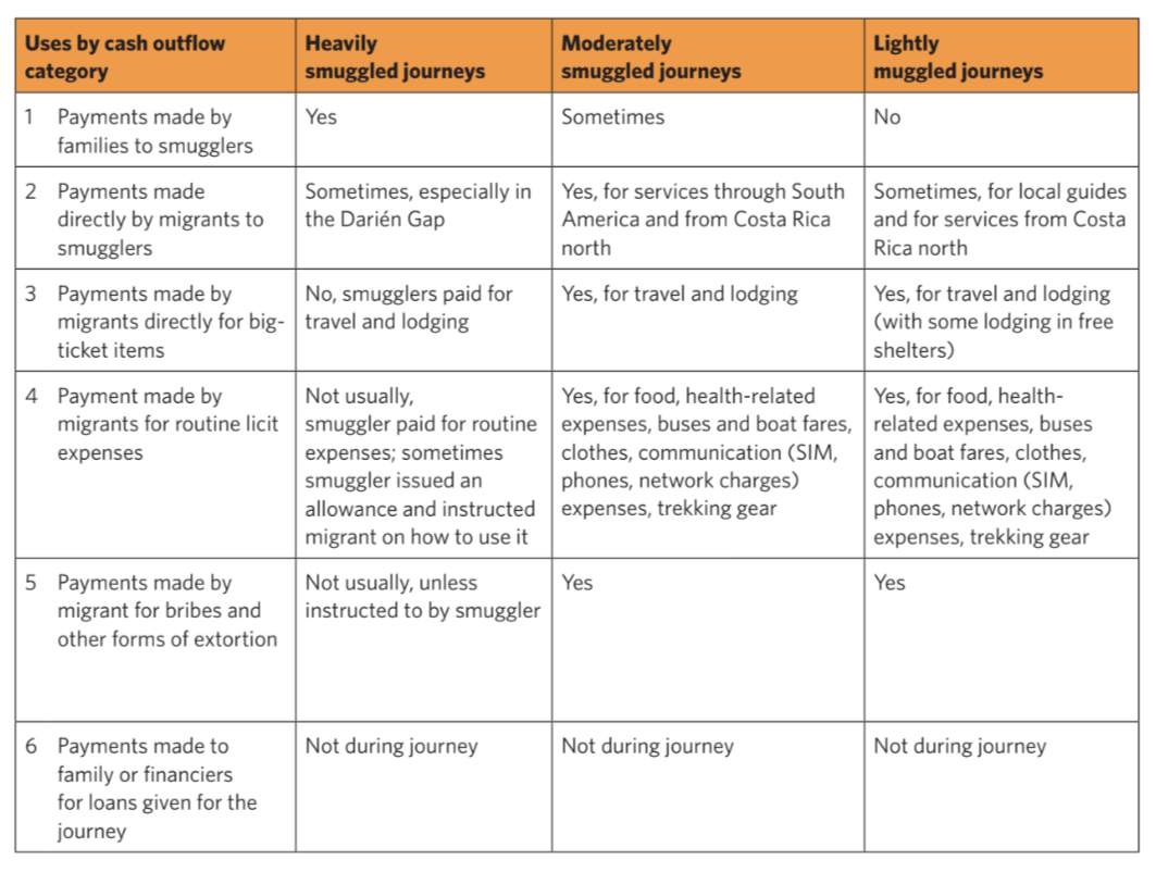 Uses of funds varied according to migrants’ priorities, their financial status in their countries of origin, and the smuggling packages they had purchased. Table 3 summarizes how migrants used their money as they moved through South America.