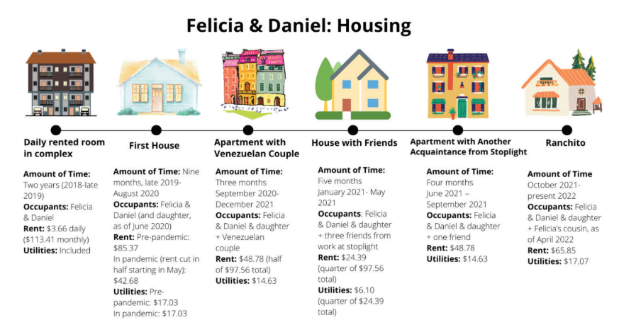 With the onset of the COVID-19 pandemic in early 2020, Felicia and Daniel received a rent reduction that required them to pay only $66 USD monthly, including utilities. But the birth of their daughter forced Felicia to temporarily stop working, so after a few months, the couple could no longer afford the house—even at the reduced rate. “We moved into a small apartment with another Venezuelan couple that we met working at the stoplight,” Felicia said, “and each couple paid half of the rent.” Felicia and Daniel paid $54 USD in rent, plus $16 USD in utilities, but after the landlord decided to sell the house, the couple soon moved again. Next, they lived with another set of friends and paid $27 USD of the $108 USD in rent, before a fall out between two of the roommates forced them to relocate.